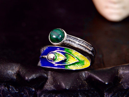 Sterling silver peacock statement ring with malachite , enamel ring, feather ring, nature ring, adjustable ring, peacock jewelry, bird ring