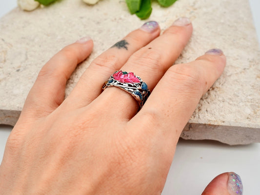 Lotus Ring, Hollow Out Statement Thumb Ring, Sterling Silver Colorful Flower Ring, Enamel Ring, Adjustable Wide Band Ring