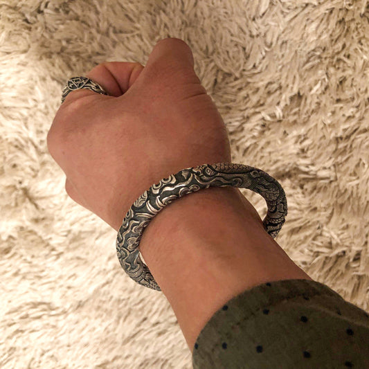 Masculine Solid Sterling Silver Dragon Bracelet Hand Engraved Mens Silver Cuff Bracelet, Viking Bracelet, Mens Silver Bangle, Dragon Jewelry, Ancient Loong