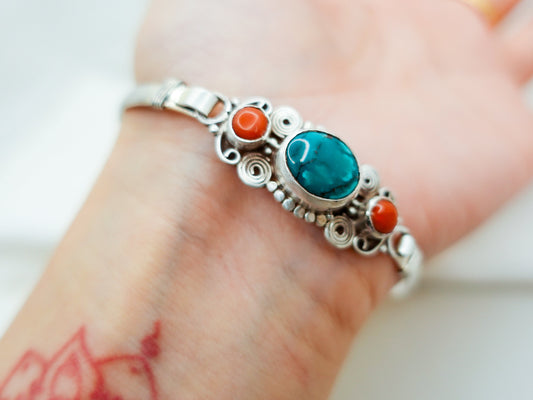 One of A Kind- Sterling Silver Turquoise Bracelet, Turquoise Coral Cuff Bracelet, Tibetan Bangle Bracelet, Vintage Jewelry Antique Cuff