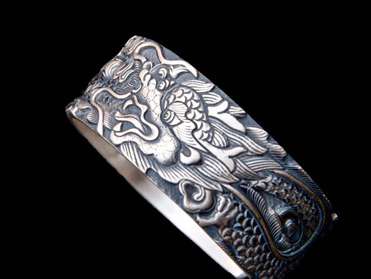 Solid Sterling Silver Dragon Wide Bracelet Handmade Mens Silver Dragon Cuff Bracelet, Wide Ancient Loong Bracelet