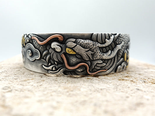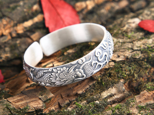 Sterling Silver Dragon Phoenix Bracelet, Wealth Eternal Love, Men Women Protection Cuff Harmony Balance Prosperity Strength Resilience