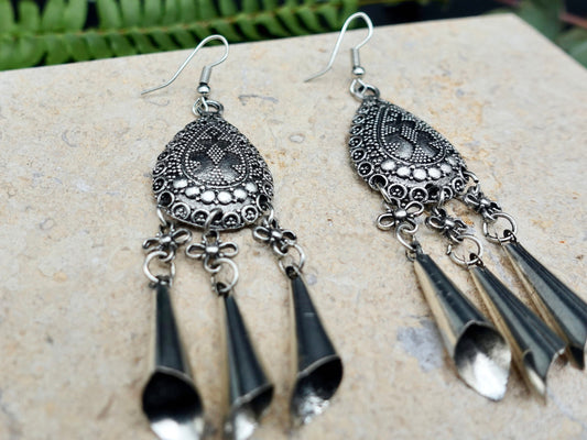 Silver Peacock Earring, Ethnic Earrings , Boho Dangle Earrings, Fringe Earrings, Artisan Chandelier Earrings