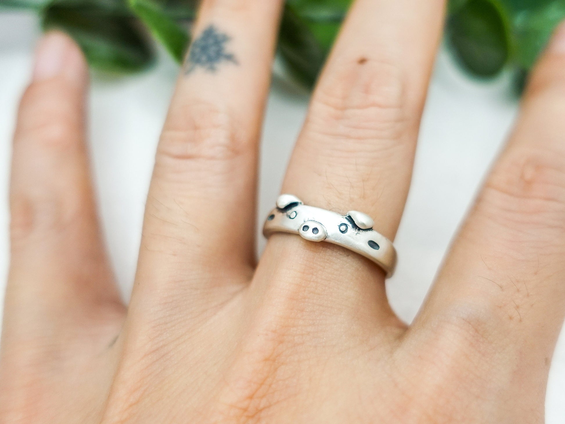 A sterling silver adjustable piglet ring is a charming and whimsical piece of jewelry – a delightful and playful accessory that captures the adorable essence of a piglet, perfect for adding a touch of charm and personality to your everyday style.
